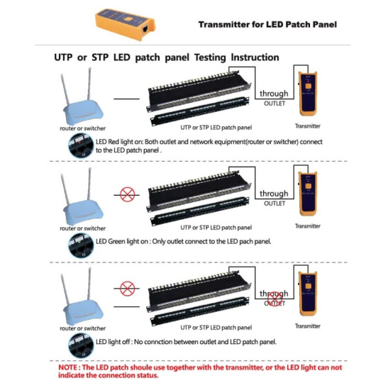 K patchpanelu dostanete vysílač, který připojíte do zásuvky např. v kanceláři a v serverovně na tomto patchpanelu jednoduše identifikujete pozici trasy na patchpanelu. Na patchpanelu se rozsvítí zelená LED. Další možnost je identifikovat volné trasy (bez připojeného zařízení). V serverovně připojíte vysílač signálu do patchpanelu a pokud je na konci trasy aktivní prvek, rozsvítí se na patchpanelu červená LED.