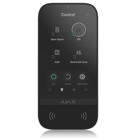 Klávesnice KeyPad TouchScreen zdědila rozhraní aplikací Ajax pro chytré telefony a poskytuje tak snadné a známé ovládání systému. Pětipalcová dotyková obrazovka umožňuje rychlý přístup k aktuálnímu režimu zabezpečení jakékoli skupiny. Aktivuje se zvednutím ruky v blízkosti a má automatickou regulaci jasu. Klávesnice má zvukovou indikaci a může upozorňovat na alarmy, zpoždění při vstupu/odchodu a otevření dveří při odjištění systému. Hlasitost se nastavuje v aplikacích Ajax. Klávesnice také zobrazuje výsledek kontroly integrity systému a informuje o poruchách při zastřežení.
