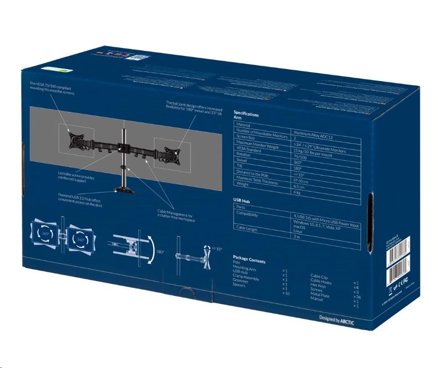 ARCTIC stolní držák Z2 (Gen3) pro 2x LCD do 34", nosnost 2x15kg, 4x USB HUB, černý (black)