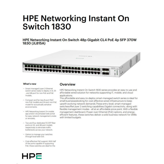 | Aruba Instant On 1830 8G Switch (JL810A) | Aruba Instant On 1830 8G 4p Class4 PoE 65W Switch (JL811A) | Aruba Instant On 1830 24G 2SFP Switch (JL812A) | Aruba Instant On 1830 24G 12p Class4 PoE 2SFP 195W Switch (JL813A) | Aruba Instant On 1830 48G 4SFP Switch (JL814A) | Aruba Instant On 1830 48G 24p Class4 PoE 4SFP 370W Switch (JL815A) | ||||