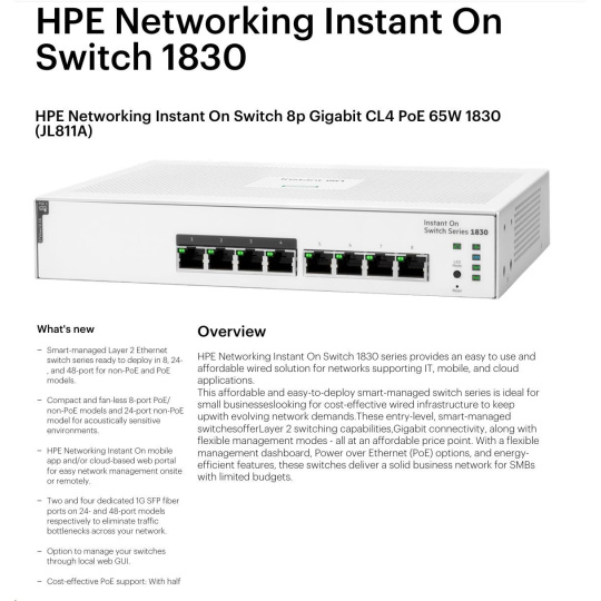 | Aruba Instant On 1830 8G Switch (JL810A) | Aruba Instant On 1830 8G 4p Class4 PoE 65W Switch (JL811A) | Aruba Instant On 1830 24G 2SFP Switch (JL812A) | Aruba Instant On 1830 24G 12p Class4 PoE 2SFP 195W Switch (JL813A) | Aruba Instant On 1830 48G 4SFP Switch (JL814A) | Aruba Instant On 1830 48G 24p Class4 PoE 4SFP 370W Switch (JL815A) | ||||
