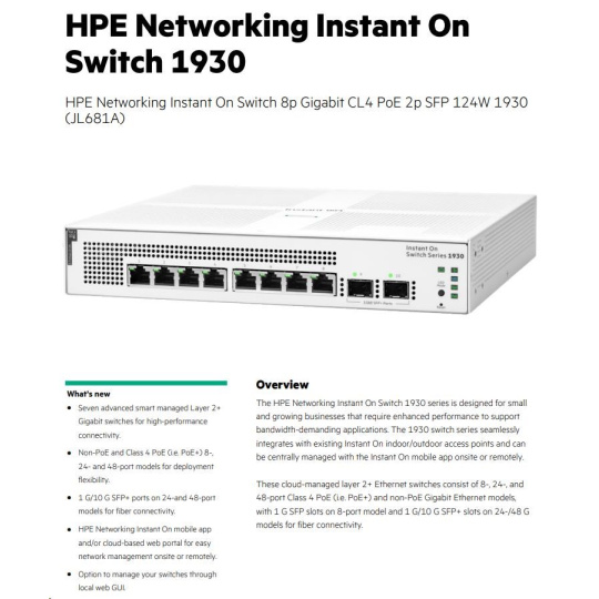 Whether you own a cafe, a design firm or a tech startup, a reliable and secure network plays a critical role in the success of your business. And you need a network solution that gives you peace of mind, allowing you to focus on growing your business instead of managing problems with your network. Aruba Instant On makes it easy to keep network users happy, mobile and IoT devices connected, and your network secure. The Aruba Instant On 1930 switches features advanced, smart-managed, fixed- configuration Gigabit switches designed for small businesses that are easy-to-deploy and affordable. They're made to handle today's bandwidth-heavy applications like voice and video conferencing, enabling consistent connectivity to enhance performance. Using either the Instant On mobile app or the cloud-based web portal, you can quickly set up, monitor and manage the 1930 switch series from anywhere at any time. What's more, up to 30 W PoE power delivery is available out-of-the-box for your class 4 PoE devices, like access points, surveillance cameras and VoIP phones, all easily managed from the same platform. Built-in security features protect your network from unauthorized access by allowing you to segment traffic and define access to each area of the network. And all of this is included in the price of the hardware - there are no hidden subscription or licensing fees.