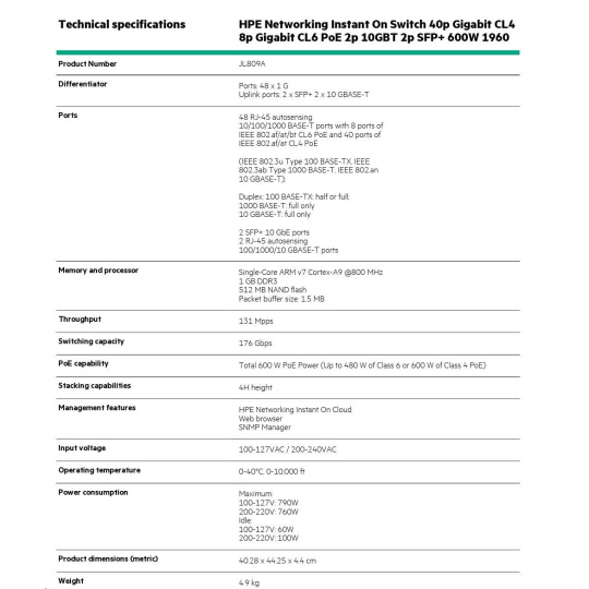 Aruba Instant On 1960 48G 40p Class4 8p Class6 PoE 2XGT 2SFP+ 600W Switch