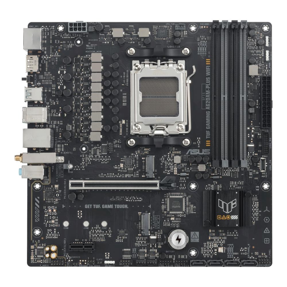 ASUS TUF GAMING A620AM-PLUS WIFI takes all the essential elements of the latest AMD Ryzen™ processors and combines them with game-ready features and proven durability. Engineered with military-grade components, an upgraded power solution and a comprehensive cooling system, this motherboard goes beyond expectations with rock-solid and stable performance for marathon gaming. TUF GAMING motherboards also undergo rigorous endurance testing to ensure that they can handle conditions where others may fail. This platform delivers the power and connectivity that advanced AI PC applications demand.