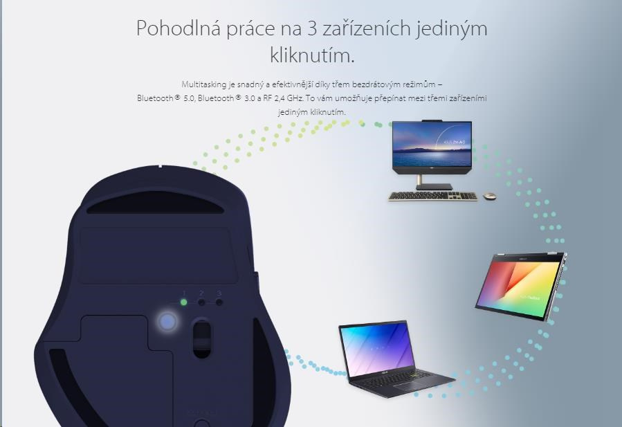 - Jedním kliknutím můžete pohodlně přepínat mezi třemi bezdrátovými zařízeními (Bluetooth® 5.0 / Bluetooth® 3.0 / RF 2,4 GHz).
