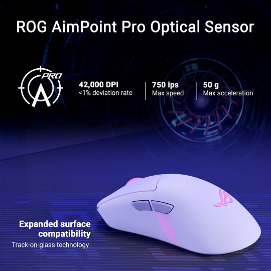 - Optický senzor ROG AimPoint Pro: Optický snímač s rozlišením 42 000 dpi pro maximální přesnost, navíc s technologií track-on-glass