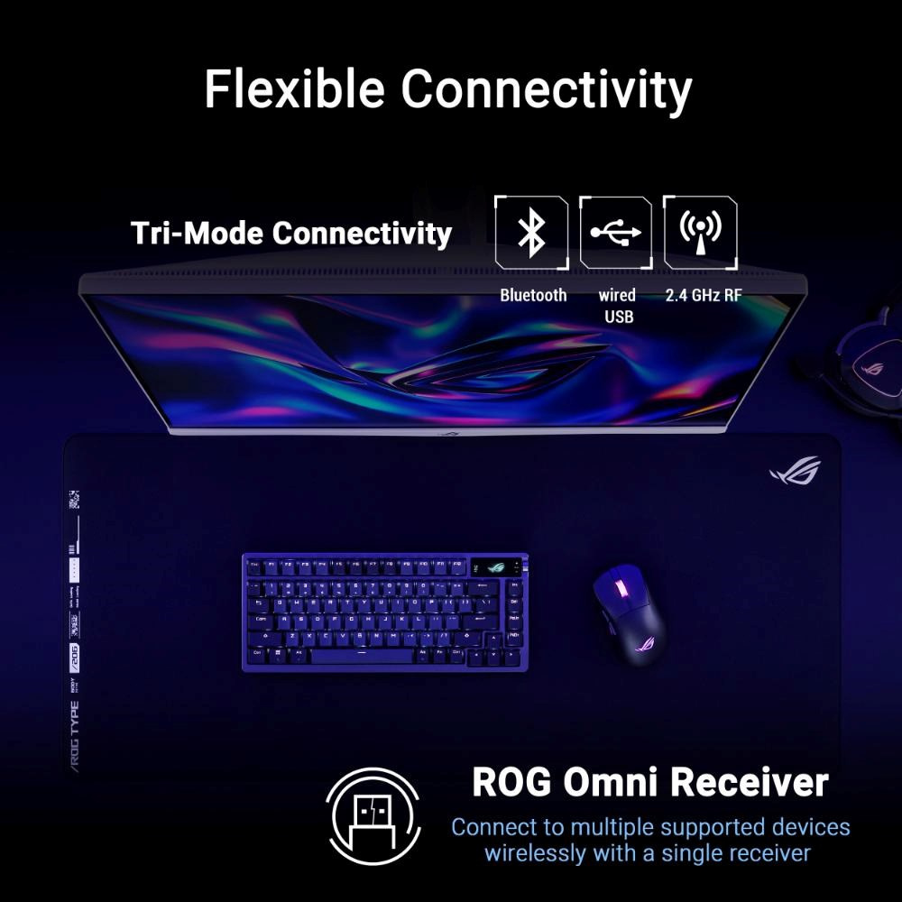 - Ultrarychlý bezdrátový výkon: Všestranné možnosti připojení: 2,4GHz bezdrátové RF, Bluetooth® a kabelové USB; přibalený přijímač ROG Omni podporuje bezdrátové připojení více zařízení pomocí jediného přijímače