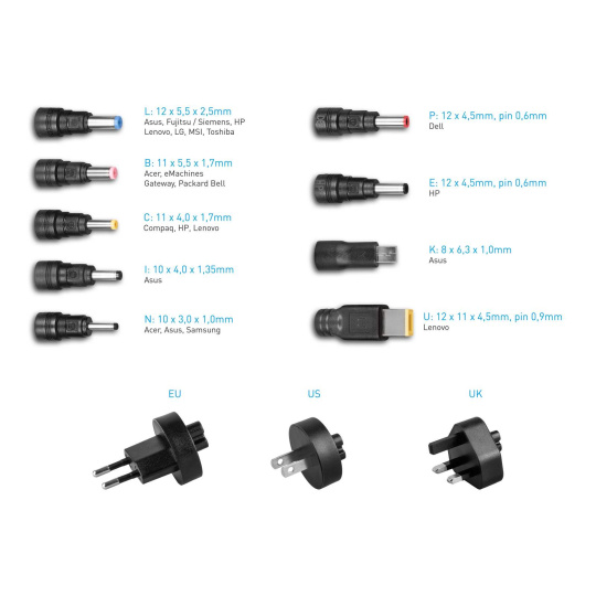 Hledané výrazy: nabíječka pro notebook, zdroj, napájecí adaptér, síťový adaptér, napájecí koncovka US, napájecí koncovka UK