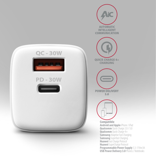 Nabíječka podporuje 20W PD nabíjení pro iPhone 12, 13, 14 a 15 a nabízí také 27W PD nabíjení pro iPhone 13 Pro, 14 Pro, 15 Pro a jejich modely Pro Max. Kromě toho podporuje 25W SFC nabíjení pro Samsung Galaxy S20 - S24, Note a Z Fold series a také nabízí 30W SFC nabíjení pro Samsung Galaxy S20 - S24 Ultra, Tab S7+ - S9+, Tab S8 - S9 Ultra. Adaptér je dále kompatibilní s dalšími standardy rychlého nabíjení telefonů, jako jsou Apple iPhone, iPad, Samsung, Huawei, Honor, Xiaomi.
