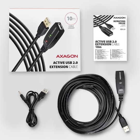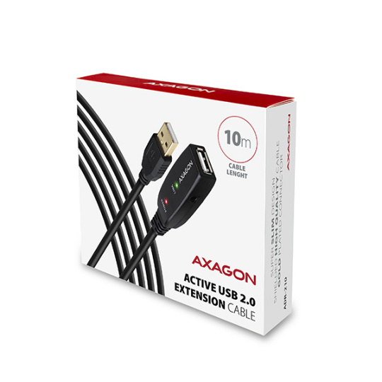 Aktivní prodlužovací USB 2.0 kabel AXAGON ADR-210 délky 10 metrů. USB repeater kabel zesiluje průchozí USB signál a umožnuje připojit výrazně vzdálenější USB zařízení než obvyklých 5 metrů při použití pasivních kabelů. Možnost spojit několik repeater kabelů za sebou.
