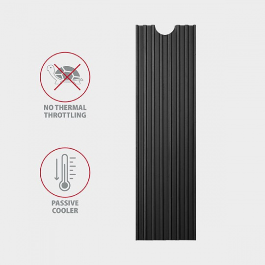 Žebrovaný hliníkový chladič vysoký 3 mm, napomáhá lepšímu odvodu tepla vzniklého při provozu M.2 SSD disku a umožňuje tak snížit teplotu disku až o 15 °C. Prodlužuje se tak životnost M.2 SSD disku a zamezí se zpomalování rychlosti disku tzv. „Thermal Throttling“.
