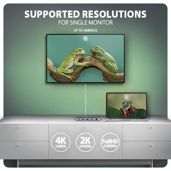 HDMI a DisplayPort výstupy poskytují kvalitní obraz. Ať při použití samostatně nebo současně, nabízí porty rozlišení až 4K/60Hz Ultra HD a podporují přenos vícekanálového zvuku. Podporovány jsou také vysoké frekvence v oblíbených hráčských rozlišeních 2K/144Hz nebo FullHD/240Hz. Díky podpoře HDR (vysoce dynamický rozsah) si můžete bez omezení vychutnat výrazně rozšířený rozsah barev a kontrastů. Pro správné fungování video výstupů je nutné, aby notebook měl USB-C port s podporou DisplayPort Alternate Mode (DP Alt Mode) nebo port Thunderbolt 3 a výše.
