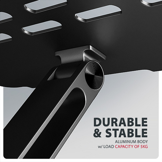 Podstavec je vyroben z robustních hliníkových odlitků garantujících dlouhou životnost a spolehlivost. Díky protiskluzové úpravě se nemusíte obávat nežádoucích pohybů – vaše zařízení zůstane pevně na svém místě, a to bez poškození povrchu notebooku či podložky. Tyto pečlivě navržené vlastnosti zaručují perfektní stabilitu pro váš notebook, tablet nebo dokonce oblíbenou knihu, což vám poskytne klid a pohodlí při každodenním používání.