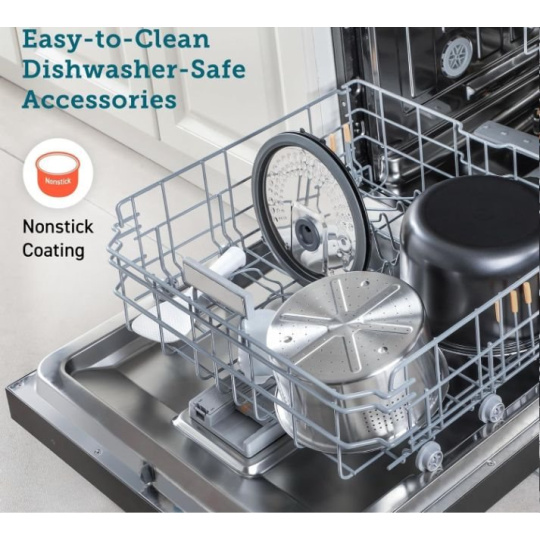 Nepřilnavý povrch zabraňuje přilepení potravin a usnadňuje čištění, které je u všeho příslušenství možné i v myčce nádobí.