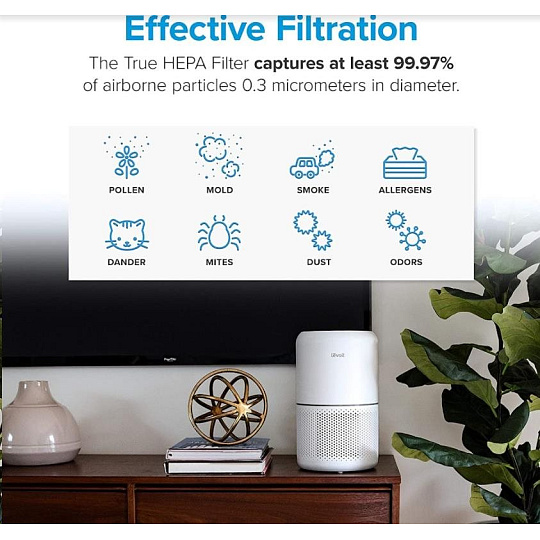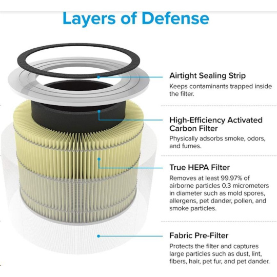 Druhou vrstvou je HEPA filtr H13. To odlišuje Levoit od konkurence, protože filtr HEPA H13 je mnohem kvalitnější a spolehlivější než běžně používané HEPA H11. Tu se odfiltrují jemné prachové částice, plíseň, bakterie, pyl, kouřové částice, roztoče a srst.