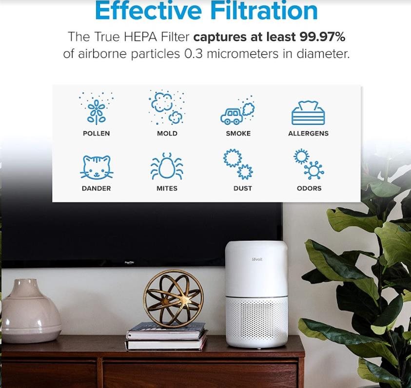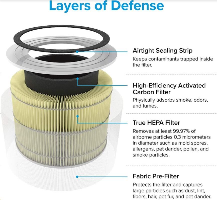Druhou vrstvou je HEPA filtr H13. To odlišuje Levoit od konkurence, protože filtr HEPA H13 je mnohem kvalitnější a spolehlivější než běžně používané HEPA H11. Tu se odfiltrují jemné prachové částice, plíseň, bakterie, pyl, kouřové částice, roztoče a srst.