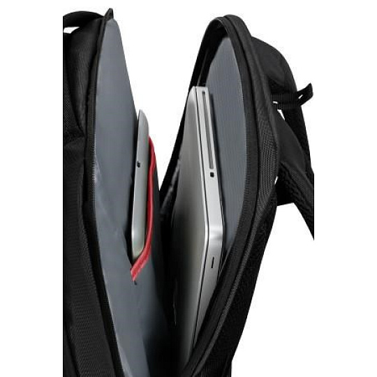 Batoh na notebook Samsonite LAPT. BACKPACK M 15,6" je rozdělen do tří částí. V první části je organizér + dvě vetší kapsy, ve druhé je kapsa na zip, kapsa na dokumenty + volný prostor. Ve třetí části je polstrování na uložení notebooku a přihrádka na tablet. Batoh má ochranné zádové polstrování, nastavitelné zádové popruhy a tzv. návlekový pásek sloužící k připevnění na rukojeť kufru.