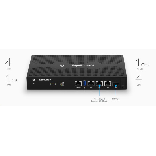 EdgeRouter 4 je vhodný všude tam, kde je nutné směrovat velké množství dat, do malých i středních firem a všude, kde je kladen důraz na bezpečnost sítě. EdgeRouter je vybaven celkem 3x Gbit ethernetovými porty, 1x SFP, dostatečně velkou operační pamětí 1GB typu DDR3, úložným prostorem o velikosti 4GB a 1x USB 3.0. Celý provoz pak řídí čtyřjádrový procesor taktovaný až na 1 GHz, MIPS64 s hardwarovou akcelerací pro zpracování paketů. EdgeRouter nabízí všechny základní funkce, které u routeru očekáváte.