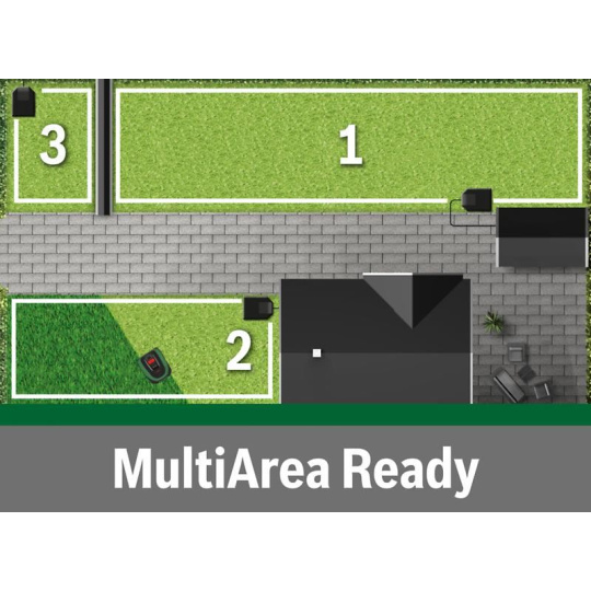 Díky funkci MultiArea si sekačka Indego může do paměti uložit až tři travní plochy (do celkové rozlohy 500 m2).