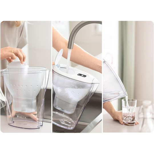 Filtrační konvice Brita pro větší pohodlí v každodenním životě. Spolehlivě redukuje vodní kámen a látky narušující chuť. Kazeta Maxtra PRO ALL-IN-1 (vydrží až 150 litrů nebo 4 týdny). Zlepšuje chuť vody, čaje a kávy. Chrání domácí spotřebiče před vodním kamenem. Celkový objem 2,4 litru, přefiltrovaná voda 1,4 litru. Vhodné do myčky nádobí (kromě víka).