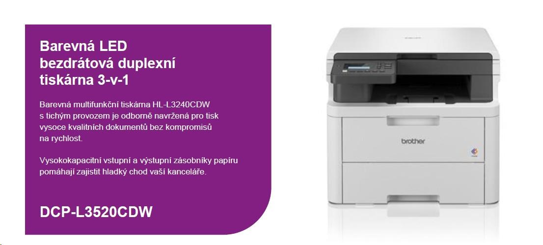 BROTHER multifunkce color LED DCP-L3520CDW - A4 18ppm 512MB 250listů USB WIFI 600dpi duplex