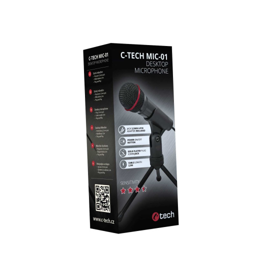 C-TECH MIC-01 je kvalitní mikrofon s přirozenou kvalitou reprodukce hlasu pro každodenní použití. Své uplatnění najde jak při použití s komunikačními programy, tak i při vytváření youtube videí nebo live přenosů. Mikrofon se připojuje pomocí 2,5m kabelu s pozlaceným stereo konektorem jack 3,5mm, v balení však naleznete i redukci jack stereo 3-pin/4-pin pro připojení mikrofonu k zařízení, které je vybaveno sloučeným audio konektorem pro mikrofon a sluchátka. Mikrofon je vybaven zapínacím tlačítkem ON/OFF. V balení naleznete praktický podstavec (tripod), díky kterému lze umístit mikrofon do různých poloh.