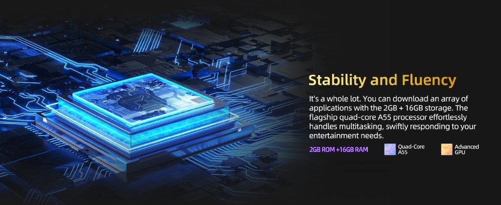 Čtyřjádrový, vysoce výkonný procesor A55 využívá nejnovější technologii nanočástic a dokáže snadno dekódovat video streamy z různých formátů. Jeho chod je zcela plynulý a garantuje rychlou odezvu. Domácí zábava ještě nikdy nebyla tak skvělá. Navíc velká 2 GB + 16 GB kapacita paměti vám umožní nainstalovat velké množství aplikací a přitom zachovat dostatek volného místa.