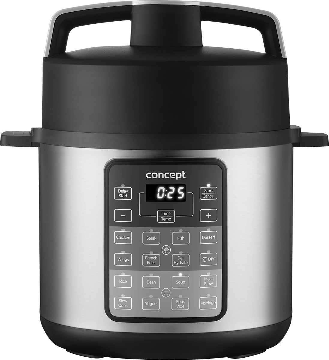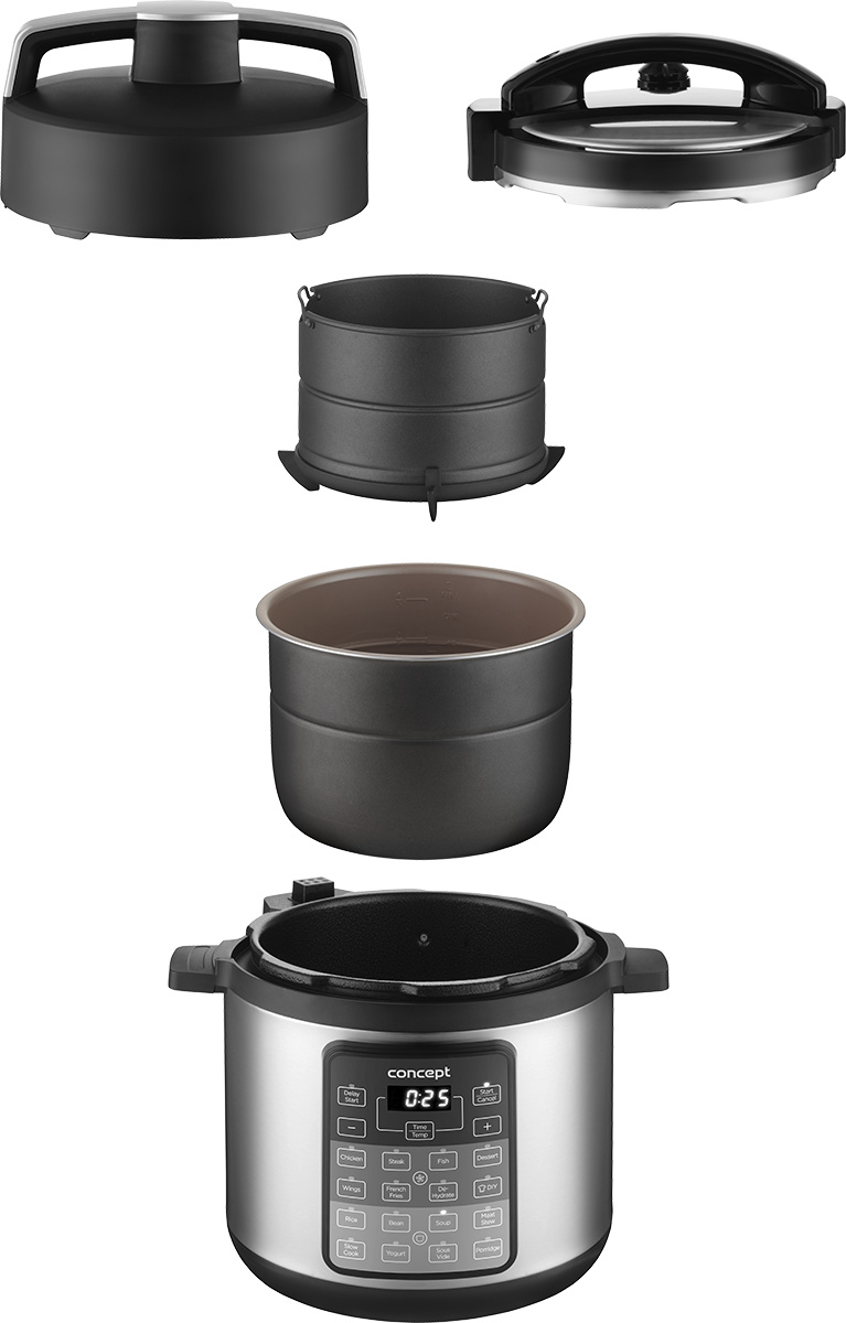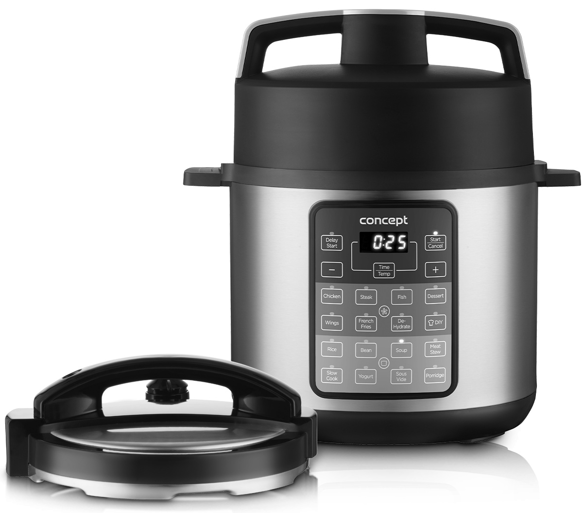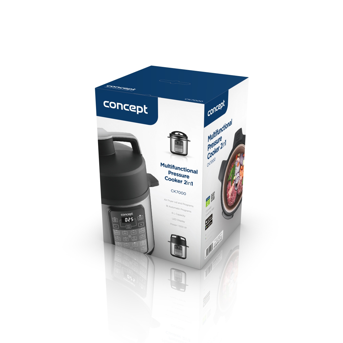 Multifunkční hrnec Concept CK7000 je vybaven dvěma poklicemi, díky kterým poskytuje opravdu široké využití. Zastane práci tlakového hrnce, horkovzdušné fritézy, rýžovaru, pomalého hrnce i jogurtovače. Snadno a rychle připravíte téměř cokoliv, na co si vzpomenete - polévku, hlavní chod i sladký dezert. Vaření v tomto hrnci je navíc velice úsporné, protože pokrm připravíte za zlomek času než v běžném hrnci nebo v troubě. Např. kuřecí stehna upečete s použitím horkovzdušné poklice za méně jak polovinu času a se 70% úsporou energie než v běžné troubě.