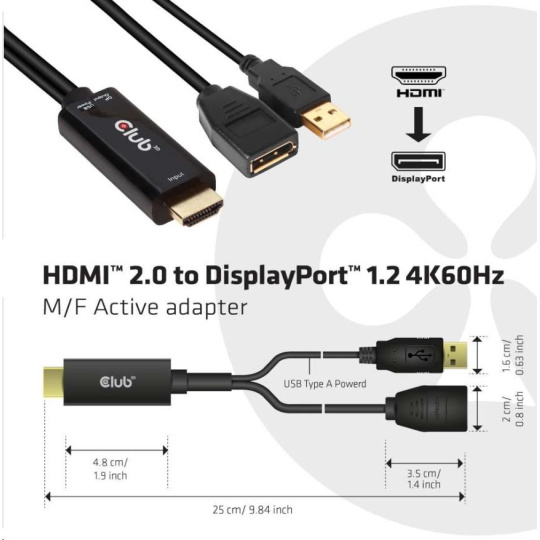 The Club 3D CAC-1331 is an HDMI™ to DisplayPort™ 1.2 Active Adapter which allows you to transmit a HDMI™ signal into a DisplayPort™signal. This product supports DP1.2 specification with resolution up to 4096 x 2160@60Hz. Besides, it is equipped with USB Type A port to supply power in case there isn’t enough power from the HDMI™ source. This Adapter is Uni-Directional.