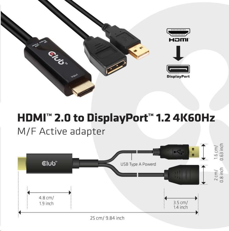 The Club 3D CAC-1331 is an HDMI™ to DisplayPort™ 1.2 Active Adapter which allows you to transmit a HDMI™ signal into a DisplayPort™signal. This product supports DP1.2 specification with resolution up to 4096 x 2160@60Hz. Besides, it is equipped with USB Type A port to supply power in case there isn’t enough power from the HDMI™ source. This Adapter is Uni-Directional.