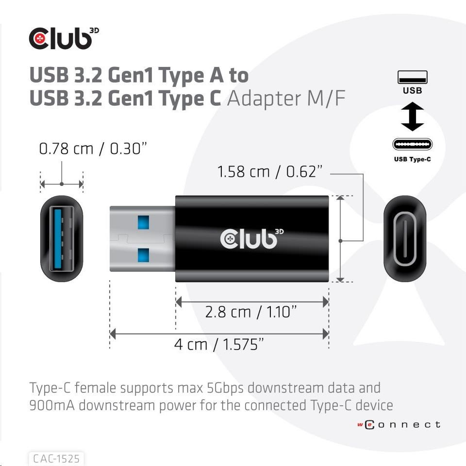 Club3D adaptér USB 3.2 Gen1 Type A na USB 3.2 Gen1 Type C (M/F), černá