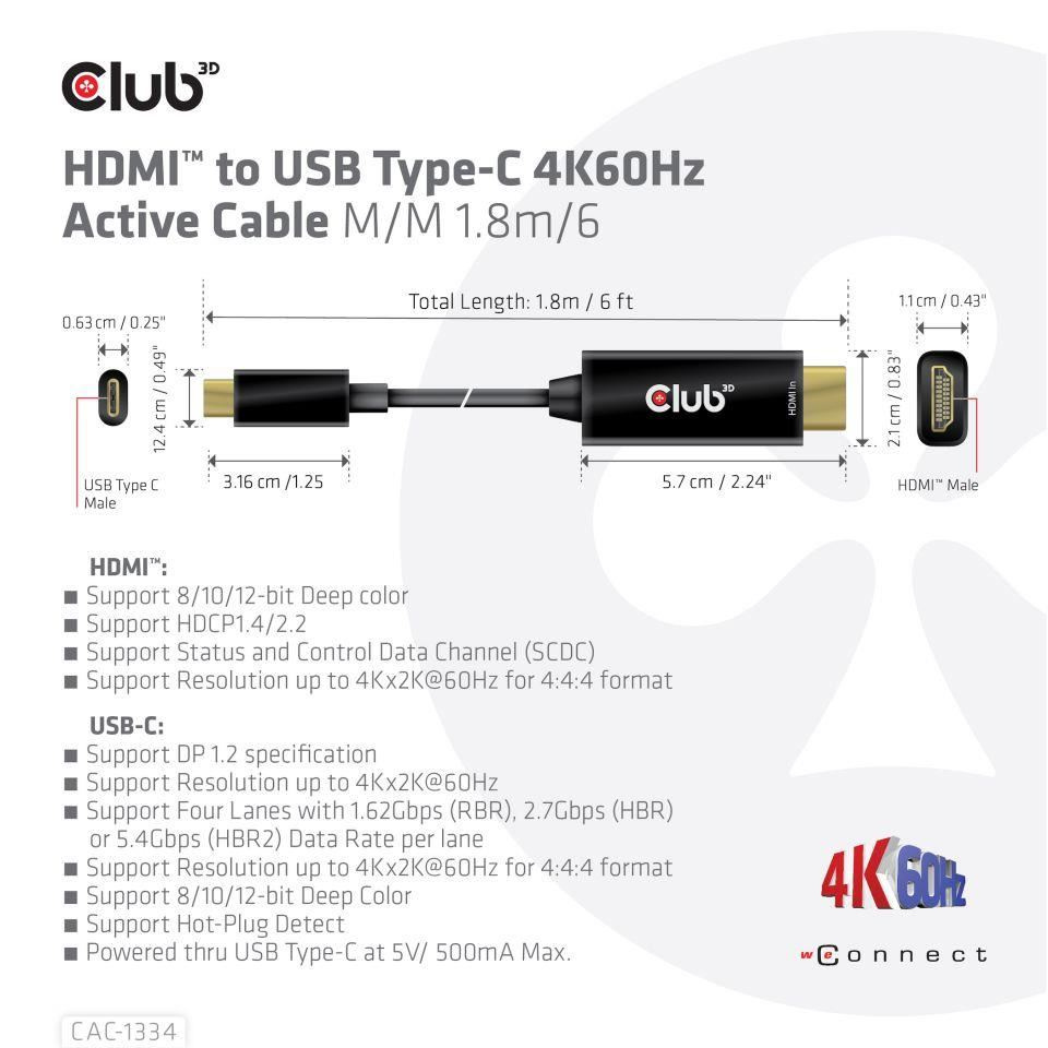 Club3D aktivní kabel HDMI na USB-C, 4K60Hz, 1.8m, M/M