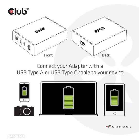 The Club 3D CAC-1906 Travel Charger 132W GAN technology, Four port USB Type-A and -C, Power Delivery(PD) 3.0 Support. This product is a high-performance, low weight travel charger with a maximum output power of 132W. Equipped with 3 USB Type-C ports and 1 Type-A port, the total output supports up to 132W, which can meet the needs of charging four devices at the same time. Compatible with multiple devices (support mobile phones,tablets and laptops). It is a convenient companion during travel and for business! Compact size & Superior Performance: GAN technology makes this charger 50% smaller than a 132W MacBook charger, small enough to carry anywhere.The 132W wall charger match a variety of PD devices from smart phones to laptops, one for all making charging simple. The Power Charger is light weight without compromising on Quality and safety. By adopting Power Delivery(PD) charging technology, this versatile Power Charger provides you with charging function through USB Type-C interface, you can charge any connected Mobilephone / Tablet / NoteBook.