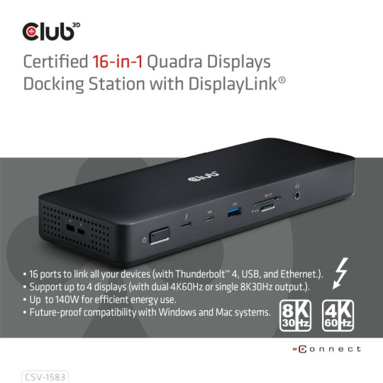 Club 3D CSV-1583 je dokovací stanice Quadra Displays 16 v 1 s certifikací Thunderbolt 4 a DisplayLink, která poskytuje nejpokročilejší, nejúčinnější a nejvšestrannější dostupné I/O řešení s rychlostí až 40 Gb/s pro data a video. Ze všech 7 video portů umožňuje výstup max. 3 videí při připojení k M1, M2 a M3; 4 videa při připojení k M1 Pro/Max, M2 Pro/Max, M3 Pro/Max a dalším notebookům řady Mac a notebookům Windows.