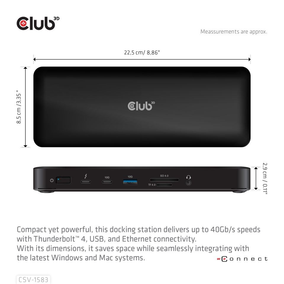 Club 3D CSV-1583 je dokovací stanice Quadra Displays 16 v 1 s certifikací Thunderbolt 4 a DisplayLink, která poskytuje nejpokročilejší, nejúčinnější a nejvšestrannější dostupné I/O řešení s rychlostí až 40 Gb/s pro data a video. Ze všech 7 video portů umožňuje výstup max. 3 videí při připojení k M1, M2 a M3; 4 videa při připojení k M1 Pro/Max, M2 Pro/Max, M3 Pro/Max a dalším notebookům řady Mac a notebookům Windows.