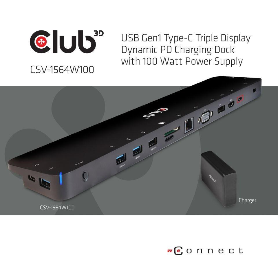 CSV-1564W100 - The Club-3D USB 3.2 Gen1 C Triple Display Dynamic PD Charging Dock is an integrated solution combining Video, Data, Power, Ethernet and Audio especially for frequent travellers. The Three different Video ports(HDMI™, DisplayPort™, VGA) allow you to enjoy 3 different images or videos on 3 different displays simultaneously under MST mode. The USB Type A ports and USB Type C data port allow you to connect multiple USB devices to the host. The USB Type C charging port allows you to provide power for this Dock and can charge the host PC at the same time by connecting a PD power Adapter, no need to carry your Notebooks Power Supply.