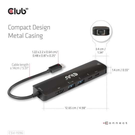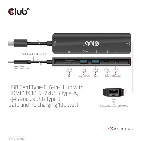 The Club 3D CSV-1596 is a USB Gen1 Type-C, 6-in-1 Hub with HDMI™8K30Hz, 2xUSB Type-A, RJ45 and 2xUSB Type-C, Data and PD charging 100 watt, providing an ideal solution for extending the port of Type-C/Thunderbolt host (PC/Laptop/Mobile phone,etc.), especially for those host with a single Type-C port. This hub adopts the latest DP1.4 Alt mode supported IC, enabling to output HDMI™ video with max. 8K30Hz and at the meanwhile transfer USB 3.1 data with max 5Gbps. The USB Type-A and Type-C data ports allow you to connect 4 USB devices simultaneously. 1 Gigabit Ethernet for super fast Ethernet. Besides, the Type-C female supports PD 3.0 PD Charging 100W (15W is dedicated to the functioning of this product, the rest power(max 85W) will be passed to charge for the host. This 6-in-1 Hub will work on all DP Alt mode supported Type-C hosts.