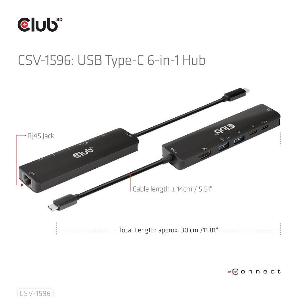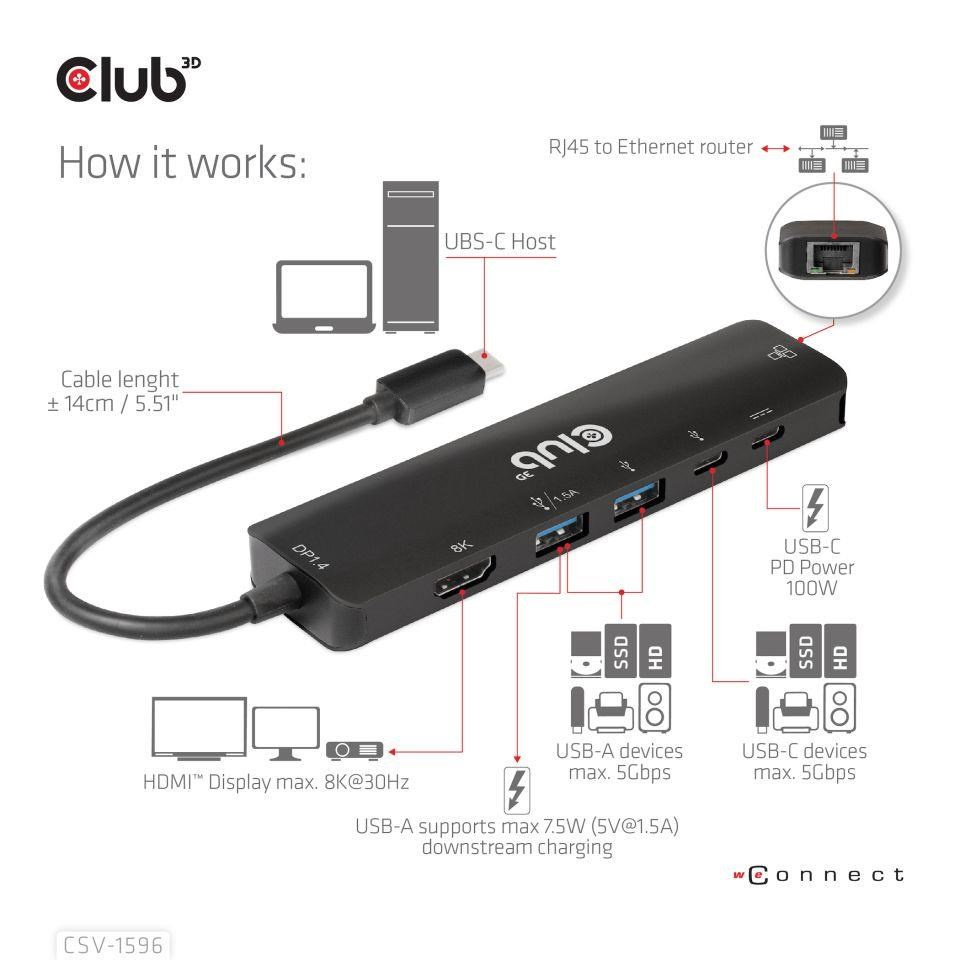 The Club 3D CSV-1596 is a USB Gen1 Type-C, 6-in-1 Hub with HDMI™8K30Hz, 2xUSB Type-A, RJ45 and 2xUSB Type-C, Data and PD charging 100 watt, providing an ideal solution for extending the port of Type-C/Thunderbolt host (PC/Laptop/Mobile phone,etc.), especially for those host with a single Type-C port. This hub adopts the latest DP1.4 Alt mode supported IC, enabling to output HDMI™ video with max. 8K30Hz and at the meanwhile transfer USB 3.1 data with max 5Gbps. The USB Type-A and Type-C data ports allow you to connect 4 USB devices simultaneously. 1 Gigabit Ethernet for super fast Ethernet. Besides, the Type-C female supports PD 3.0 PD Charging 100W (15W is dedicated to the functioning of this product, the rest power(max 85W) will be passed to charge for the host. This 6-in-1 Hub will work on all DP Alt mode supported Type-C hosts.