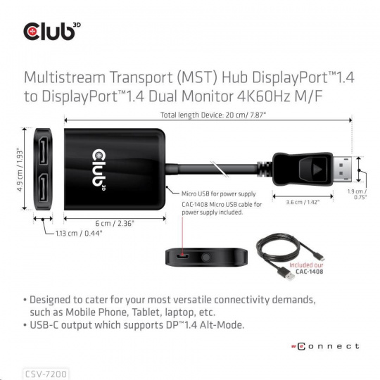 The CSV-7200 is a DP™1.4 Alt Mode to DisplayPort™ Dual Monitor 4K60Hz M/F MST hub. This DisplayPort™ MST hub is designed to cater for your most versatile connectivity demands, such as Tablet, laptop, etc. with a DisplayPort™1.4 output which supports DP™1.4 Alt-Mode.