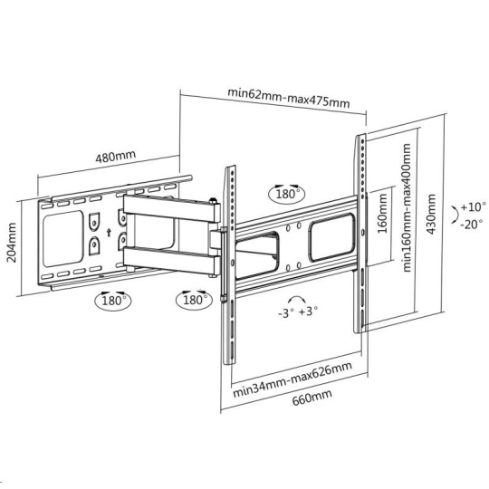 - Rozměry držáku (š x v x h): 660 x 430 x 62~475 mm