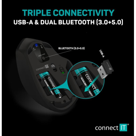 CONNECT IT Triple SmartSwitch bezdrátová myš, 2.4 GHz & Bluetooth 5.0, černá
