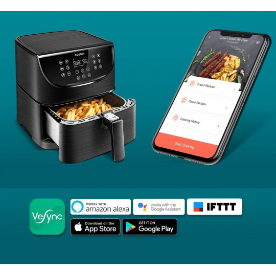 S horkovzdušnou fritézou COSORI CS158-AF PREMIUM SMART si můžete užít vaše oblíbená smažená jídla bez výčitek, protože na rozdíl od běžného smažení nebo fritování je v této horkovzdušné fritéze možné připravovat jídla za použití velice malého množství oleje nebo vůbec žádného. Kombinace cirkulujícího horkého vzduchu, dokonalé teploty vaření a chytrých programů zajistí, že hranolky budou vždy krásně křupavé a kuřecí stehna šťavnatá. Programy si rychle a pohodlně můžete nastavit také přes Smartphone nebo Amazon Alexa a Google Assistant. Až budete mít hotovo, čištění bude stejně snadné díky nepřilnavému koši, který lze mýt v myčce. Díky veliké nádobě s objemem 5,5l navíc dokážete rychle navařit i pro větší rodinu nebo skupinu hostů.