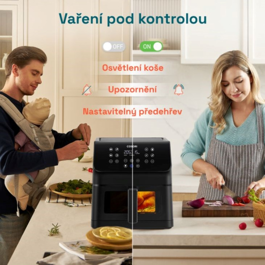 Představujeme horkovzdušnou fritézu Cosori Premium II ve verzi Plus. Inovované řešení, které nejen šetří čas, ale také energii a nabízí způsob vaření, který je šetrný ke zdraví. S horkovzdušnou fritézou si můžete užívat oblíbená jídla připravovaná s minimem oleje, vyhnete se zápachu ze smažení a také úklid je díky možnosti mýt koš v myčce hračkou. Fritéza nabídne koš se štědrým objemem 6,2 litrů, takže v ní je možné pohodlně připravit jídlo pro 3-5 lidí, například celé, 2,3 kg kuře. Verze Plus je vybavena okénkem a osvětlením, takže máte přehled, v jaké fázi se příprava nachází bez nutnosti vysouvání koše a přerušování přípravy. Při vysoké objemu si fritéza zachová malé vnější rozměry, takže se hodí i do malých kuchyní. S technologií 360° cirkulujícího vzduchu se fritéza zahřeje na provozní teplotu do 5 minut a dále výrazně zkracuje dobu vaření. Malý objem také znamená malou spotřebu energie ve srovnání s běžnou troubou. Fritéza nabídne 12 programů pro přípravu pokrmů, které je možné upravit podle individuálních chutí. Displej fritézy je přehledný a pohodlně nakloněný pro perfektní čitelnost. V dnešní digitální době je také poměrně atraktivní funkce vypnutí zvuku tlačítek. Jako bonus k dodávané vícejazyčné kuchařce si můžete stáhnout e-kuchařku s 80 recepty v češtině i slovenštině. V balení navíc najdete 5ks špízových jehel a špízový rošt.