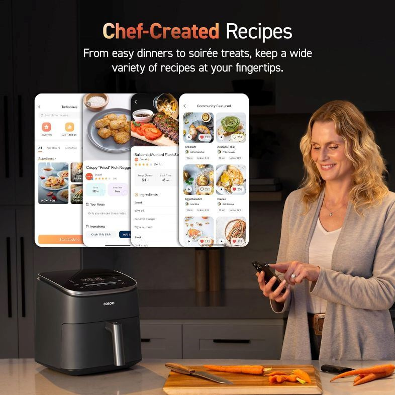S fritézou Cosori TurboBlaze si můžete stáhnout naši bezplatnou aplikaci VeSync, ve která najdete více receptů a inspirací od našich profesionálních kuchařů.