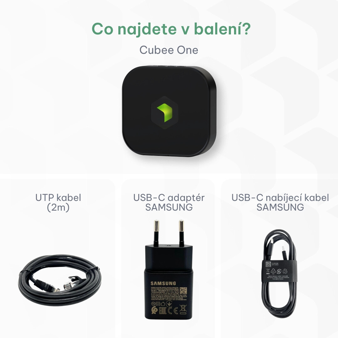Obsah balení: Cubee One, napájecí zdroj Samsung USB-C 15W černý, 1.8m napájecí kabel Samsung USB-C černý, 3m UTP kabel černý pro připojení ke střídači