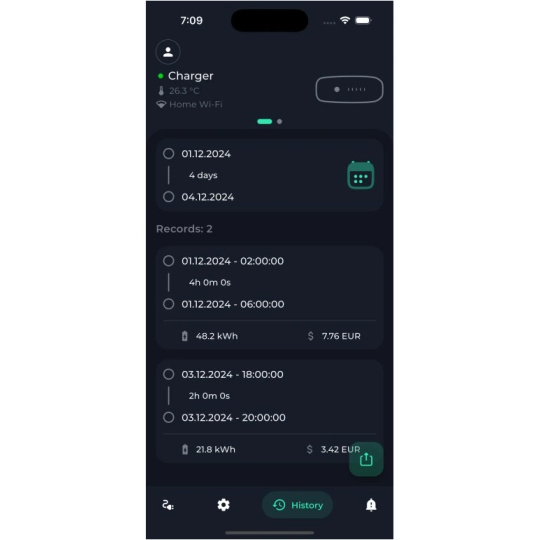 - nastavení částky za kWh a měny pro součet hodnot v historii nabíjení