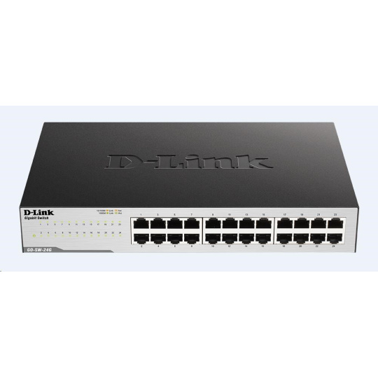 • 16 or 24 Gigabit LAN ports for high-speed wired connections • Plug-and-play installation for convenience Reliability • Embedded 4 kV surge protection on all Gigabit Ethernet ports • Durable metal housing • Rack mountable • Fanless design Energy-Efficient and Eco-Friendly • Reduces power to a port when there is no traffic • Optimises power usage of a port based on the length of the cable connected to it • Energy-efficient design reduces heat generated and allows switch to run silently 24-Port GIGABIT EASY DESKTOP SWITCH - 24-Port Gigabit Switch - Auto MDI.MDIZ crossover for all ports - Full/half-duplex for Ethernet / Fast Ethernet speeds - Plug-and-play installation - Energy Star Level V qualified - D-Link Green (Automatic port powerdown for unused ports) - Internal universal PSU w/ power cord - Metal housing, black, Desktop and Rackmount (Rubber feet and Rackmount kit included), 1 HE.