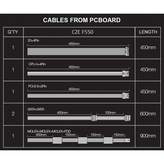 • 1x MOLEX, 450mm + MOLEX 150mm + MOLEX 150 mm + FDD 150 mm