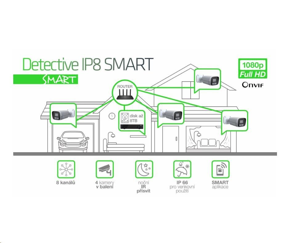 8 kanálový kamerový systém EVOLVEO Detective IP8 SMART je ideální řešení pro monitorování a bezpečnost vašeho domu, kanceláří, skladu nebo firmy. Jedná se o kompaktní kamerový systém, který využívá k připojení kamer lokální počítačovou síť. Kamery jsou před nastavené a předem spárované s NVR jednotkou. Jeho čistý obraz jak ve dne tak v noci využijete pro ochranu a monitorování nejen vaše rodinného domku nebo firmy, ale i pro dozor nad prodejnou nebo pro dohled nad veřejným prostranstvím. Veškeré události se nahrávají přímo na pevný disk, který vložíte do hlavní jednotky, a tak máte vaše data plně pod kontrolou. K záznamu máte přístup pomocí mobilní aplikace pro iOS a Android, nebo iCMS programu pro OS WIndows. Záznam lze také prohlížet na monitoru připojeném přímo do NVR jednotky pomocí HDMI nebo VGA kabelu.