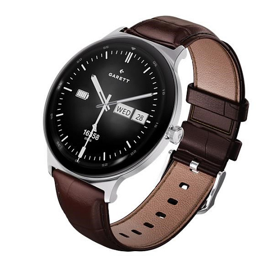 - Sada obsahuje: smartwatch GARETT, náhradní kožený řemínek (černý / hnědý dle varianty), nabíjecí základna USB, QSG návod